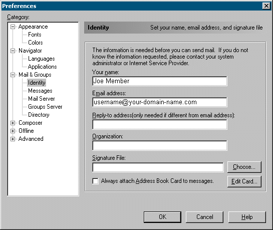 On the Preferences dialog that comes up, go to the Identity category as shown in Figure 1 below.