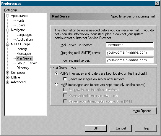 Click OK to save your information and finish setting up your mail account.Congratulations! You have successfully completed setting up your e-mail to work in Netscape Messenger 4.0.